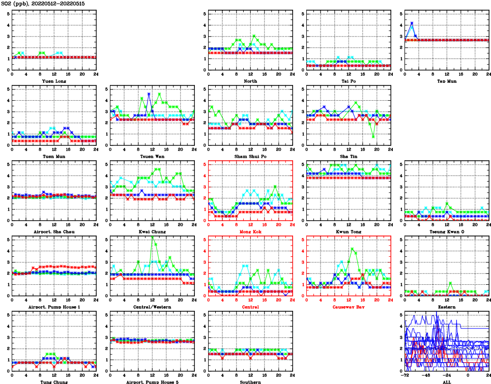 | Air Quality Data Time Series for SO2 (2022/05/15) | ( Line colors: Day -3 Day -2 Day -1 Current day ) | 2D Map Current AQHI |