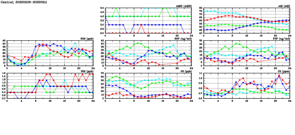 | Air Quality Data Time Series in Central (2022/05/11) | ( Line colors: Day -3 Day -2 Day -1 Current day ) | 2D Map Current AQHI |
