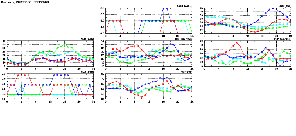 | Air Quality Data Time Series in Eastern (2022/05/09) | ( Line colors: Day -3 Day -2 Day -1 Current day ) | 2D Map Current AQHI |