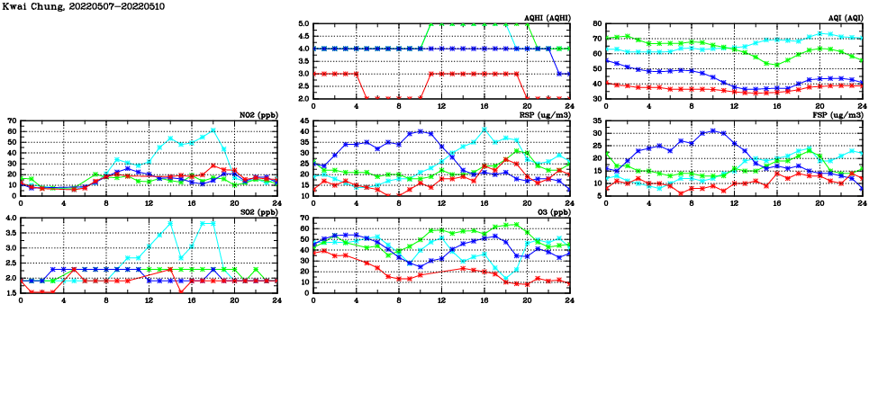 | Air Quality Data Time Series in Kwai Chung (2022/05/10) | ( Line colors: Day -3 Day -2 Day -1 Current day ) | 2D Map Current AQHI |