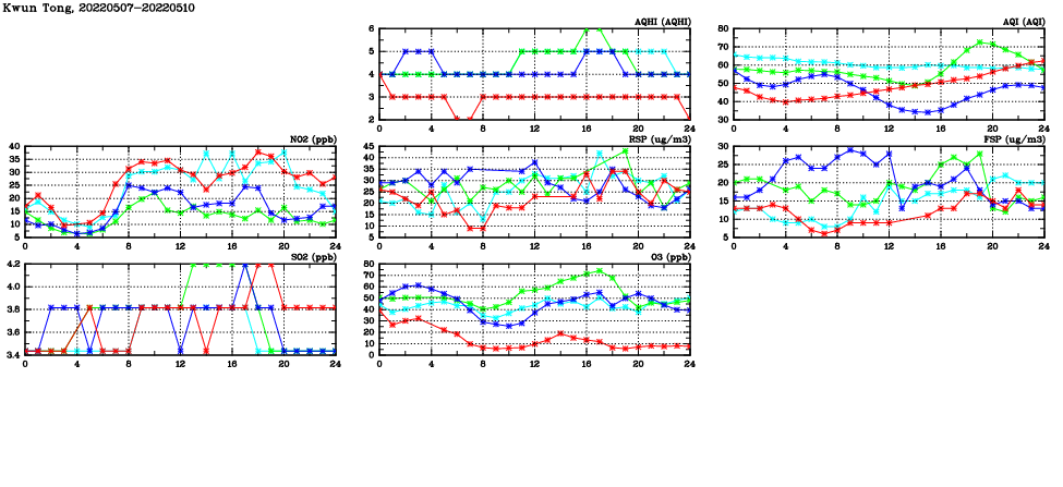 | Air Quality Data Time Series in Kwun Tong (2022/05/10) | ( Line colors: Day -3 Day -2 Day -1 Current day ) | 2D Map Current AQHI |