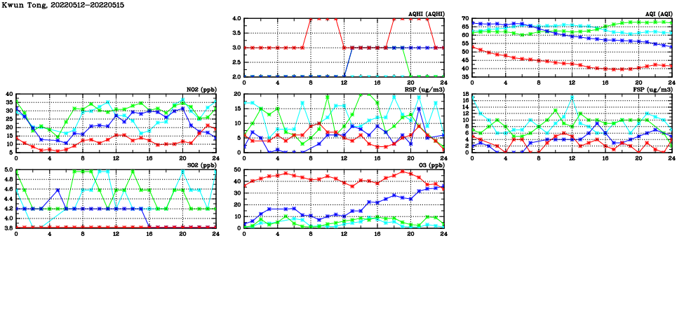 | Air Quality Data Time Series in Kwun Tong (2022/05/15) | ( Line colors: Day -3 Day -2 Day -1 Current day ) | 2D Map Current AQHI |