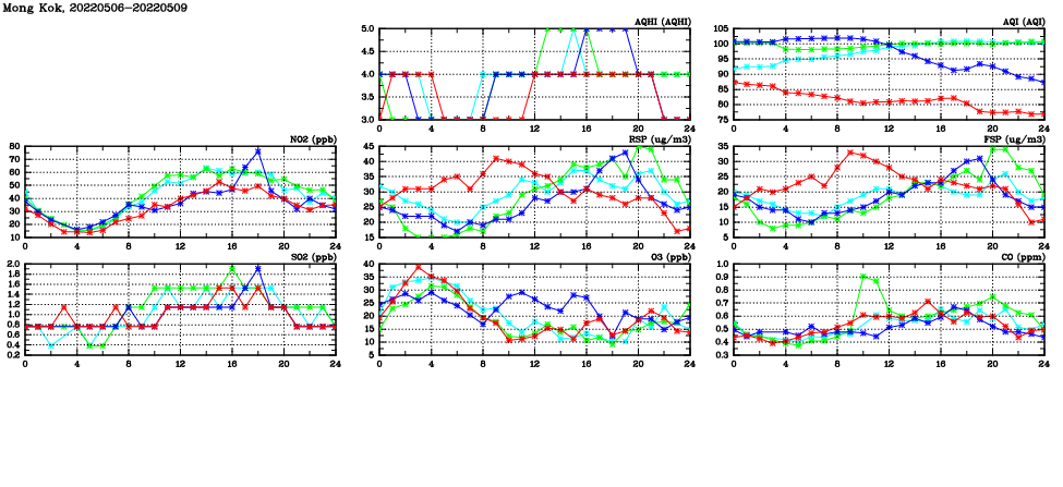 | Air Quality Data Time Series in Mong Kok (2022/05/09) | ( Line colors: Day -3 Day -2 Day -1 Current day ) | 2D Map Current AQHI |