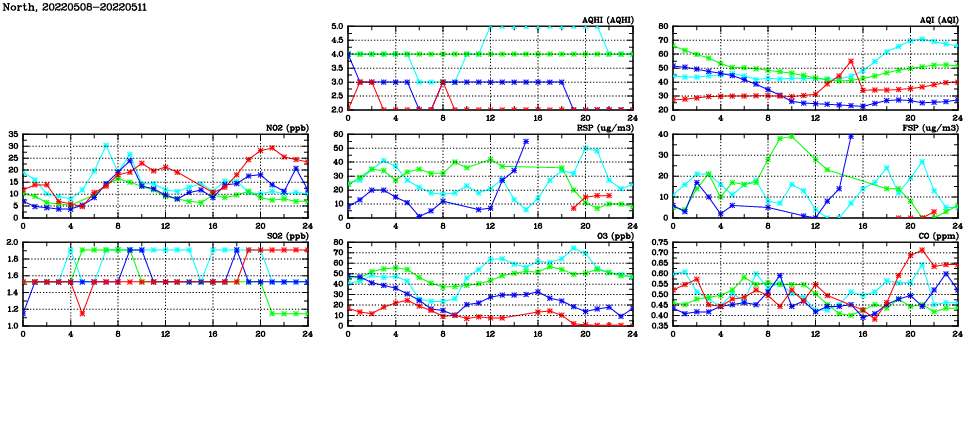 | Air Quality Data Time Series in North (2022/05/11) | ( Line colors: Day -3 Day -2 Day -1 Current day ) | 2D Map Current AQHI |