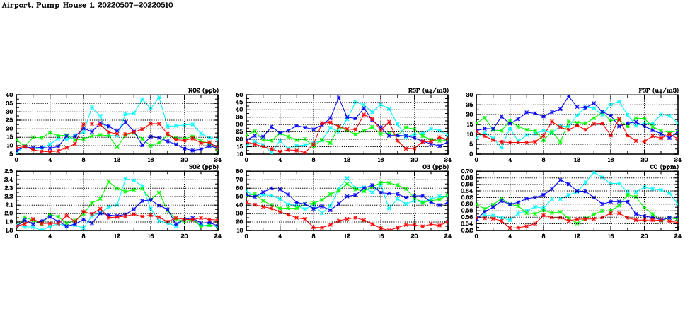 Air Quality Data Time Series in Airport, Pump House 1 (2022/05/10) | ( Line colors: Day -3 Day -2 Day -1 Current day ) | 2D Map Current AQHI |
