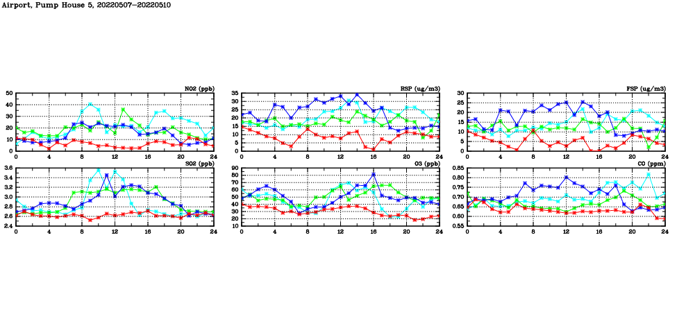 | Air Quality Data Time Series in Airport, Pump House 5 (2022/05/10) | ( Line colors: Day -3 Day -2 Day -1 Current day ) | 2D Map Current AQHI |
