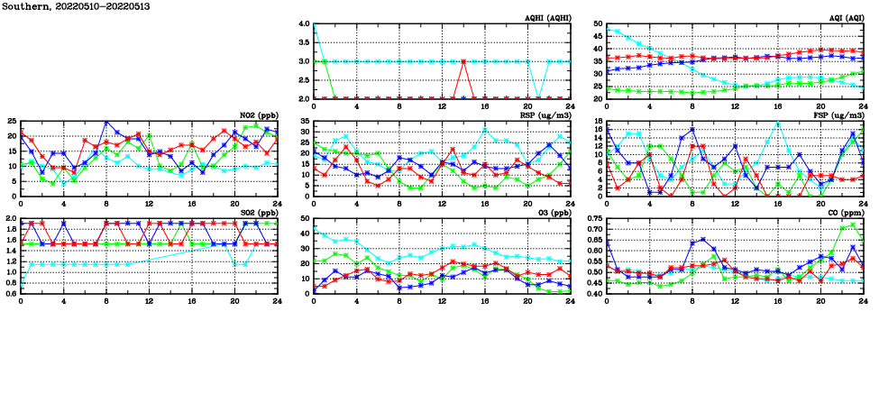 | Air Quality Data Time Series in Southern (2022/05/13) | ( Line colors: Day -3 Day -2 Day -1 Current day ) | 2D Map Current AQHI |