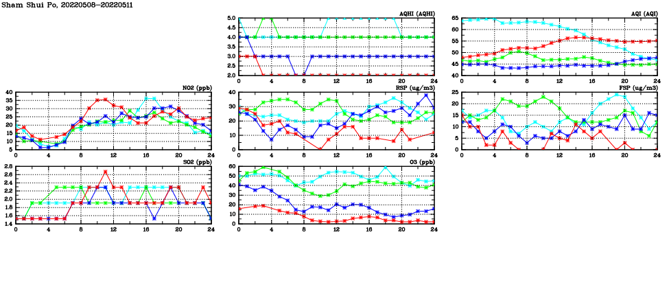 | Air Quality Data Time Series in Sham Shui Po (2022/05/11) | ( Line colors: Day -3 Day -2 Day -1 Current day ) | 2D Map Current AQHI |