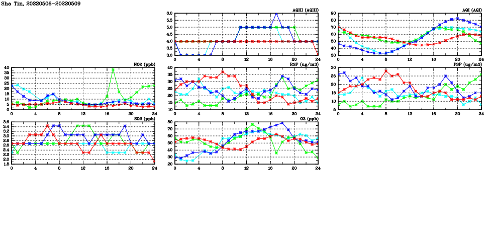 | Air Quality Data Time Series in Sha Tin (2022/05/09) | ( Line colors: Day -3 Day -2 Day -1 Current day ) | 2D Map Current AQHI |