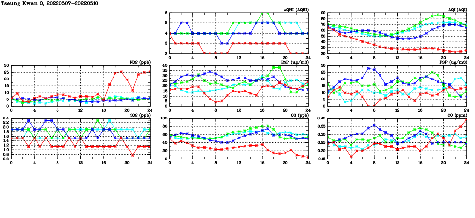 | Air Quality Data Time Series in Tseung Kwan O (2022/05/10) | ( Line colors: Day -3 Day -2 Day -1 Current day ) | 2D Map Current AQHI |
