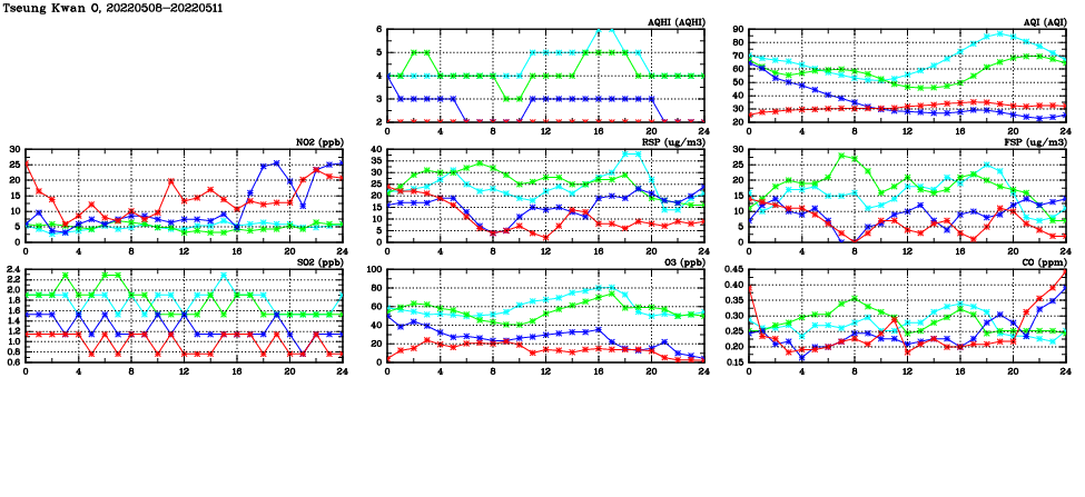 | Air Quality Data Time Series in Tseung Kwan O (2022/05/11) | ( Line colors: Day -3 Day -2 Day -1 Current day ) | 2D Map Current AQHI |