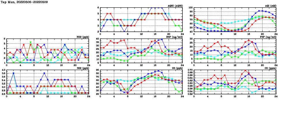 | Air Quality Data Time Series in Tap Mun (2022/05/09) | ( Line colors: Day -3 Day -2 Day -1 Current day ) | 2D Map Current AQHI |