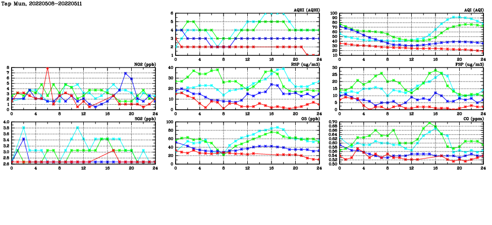 | Air Quality Data Time Series in Tap Mun (2022/05/11) | ( Line colors: Day -3 Day -2 Day -1 Current day ) | 2D Map Current AQHI |