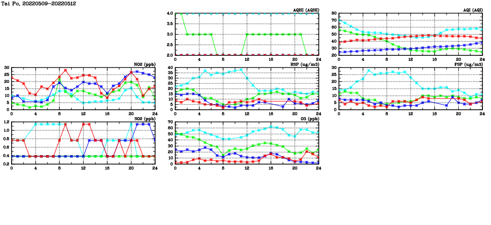 | Air Quality Data Time Series in Tai Po (2022/05/12) | ( Line colors: Day -3 Day -2 Day -1 Current day ) | 2D Map Current AQHI |