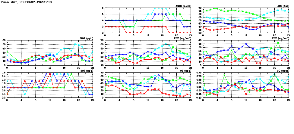 | Air Quality Data Time Series in Tuen Mun (2022/05/10) | ( Line colors: Day -3 Day -2 Day -1 Current day ) | 2D Map Current AQHI |