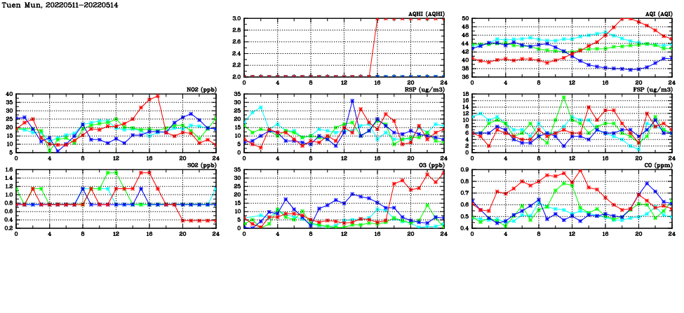 | Air Quality Data Time Series in Tuen Mun (2022/05/14) | ( Line colors: Day -3 Day -2 Day -1 Current day ) | 2D Map Current AQHI |