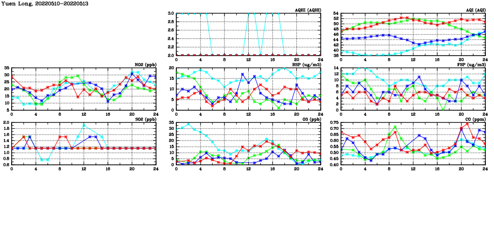 | Air Quality Data Time Series in Yuen Long (2022/05/13) | ( Line colors: Day -3 Day -2 Day -1 Current day ) | 2D Map Current AQHI |