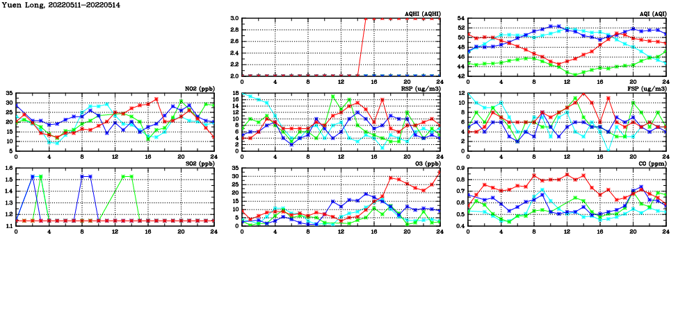 | Air Quality Data Time Series in Yuen Long (2022/05/14) | ( Line colors: Day -3 Day -2 Day -1 Current day ) | 2D Map Current AQHI |