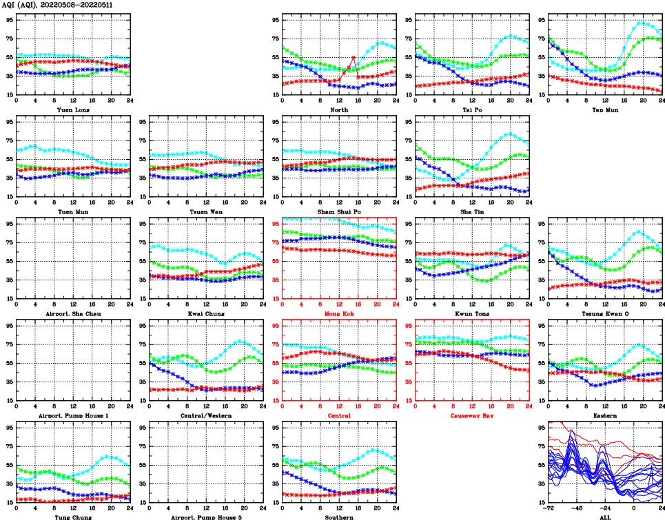 | Air Quality Data Time Series for AQI (2022/05/11) | ( Line colors: Day -3 Day -2 Day -1 Current day ) | 2D Map Current AQHI |