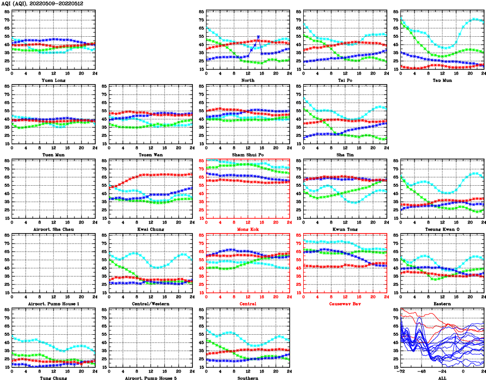 | Air Quality Data Time Series for AQI (2022/05/12) | ( Line colors: Day -3 Day -2 Day -1 Current day ) | 2D Map Current AQHI |