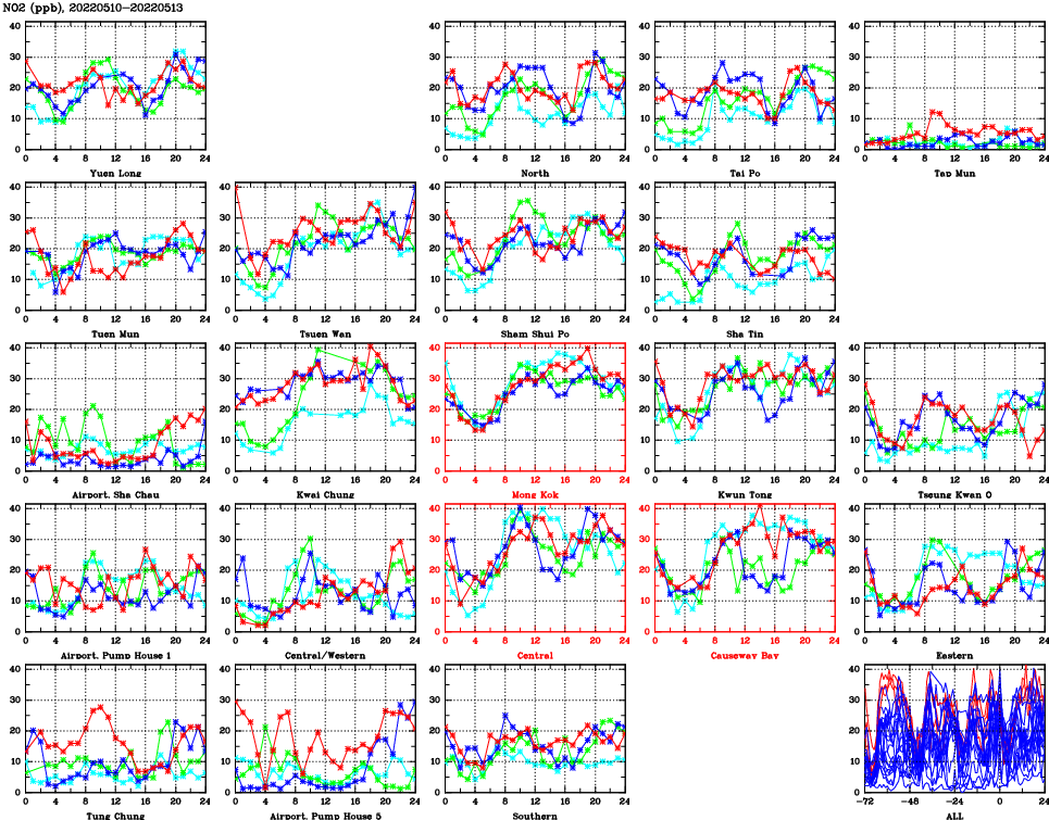 | Air Quality Data Time Series for NO2 (2022/05/13) | ( Line colors: Day -3 Day -2 Day -1 Current day ) | 2D Map Current AQHI |