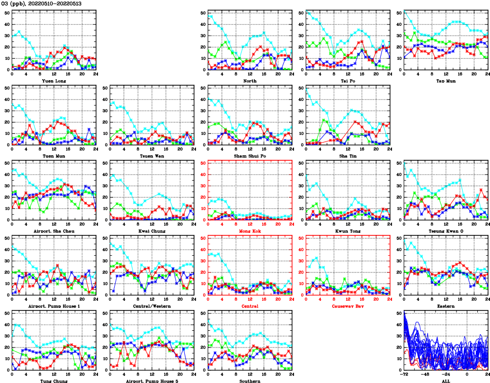 | Air Quality Data Time Series for O3 (2022/05/13) | ( Line colors: Day -3 Day -2 Day -1 Current day ) | 2D Map Current AQHI |