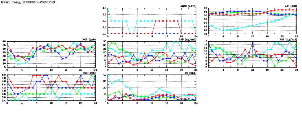 | Air Quality Data Time Series in Kwun Tong (2022/05/13) | ( Line colors: Day -3 Day -2 Day -1 Current day ) | 2D Map Current AQHI |