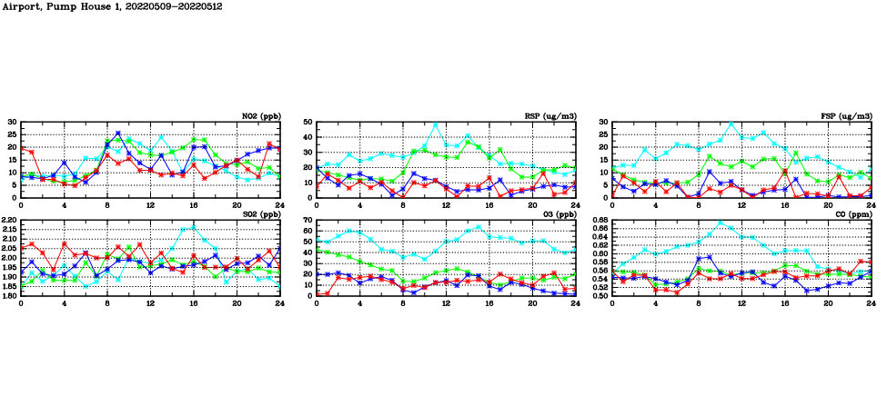 | Air Quality Data Time Series in Airport, Pump House 1 (2022/05/12) | ( Line colors: Day -3 Day -2 Day -1 Current day ) | 2D Map Current AQHI |
