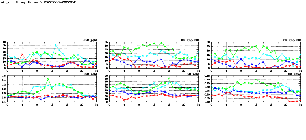 | Air Quality Data Time Series in Airport, Pump House 5 (2022/05/11) | ( Line colors: Day -3 Day -2 Day -1 Current day ) | 2D Map Current AQHI |
