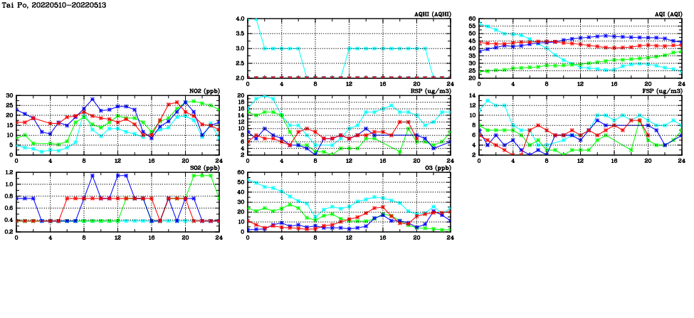 | Air Quality Data Time Series in Tai Po (2022/05/13) | ( Line colors: Day -3 Day -2 Day -1 Current day ) | 2D Map Current AQHI |