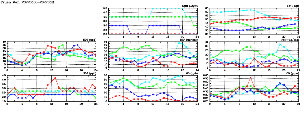 | Air Quality Data Time Series in Tsuen Wan (2022/05/11) | ( Line colors: Day -3 Day -2 Day -1 Current day ) | 2D Map Current AQHI |