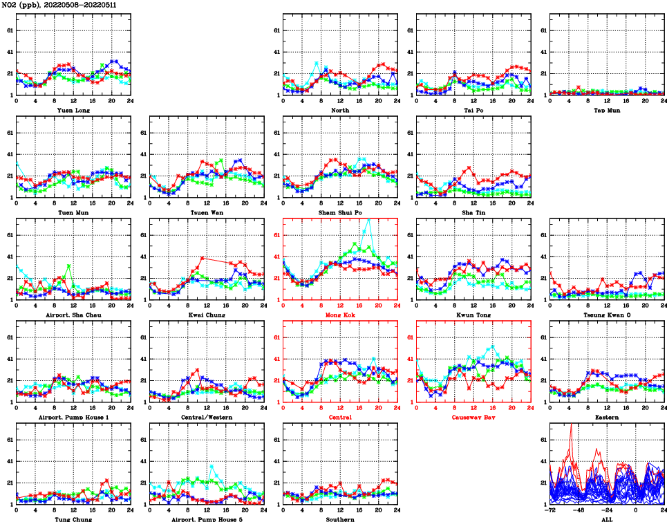 | Air Quality Data Time Series for NO2 (2022/05/11) | ( Line colors: Day -3 Day -2 Day -1 Current day ) | 2D Map Current AQHI |