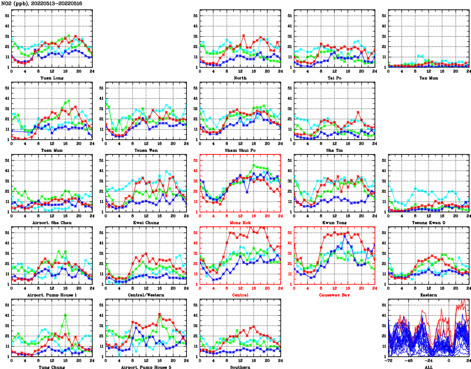 | Air Quality Data Time Series for NO2 (2022/05/16) | ( Line colors: Day -3 Day -2 Day -1 Current day ) | 2D Map Current AQHI |