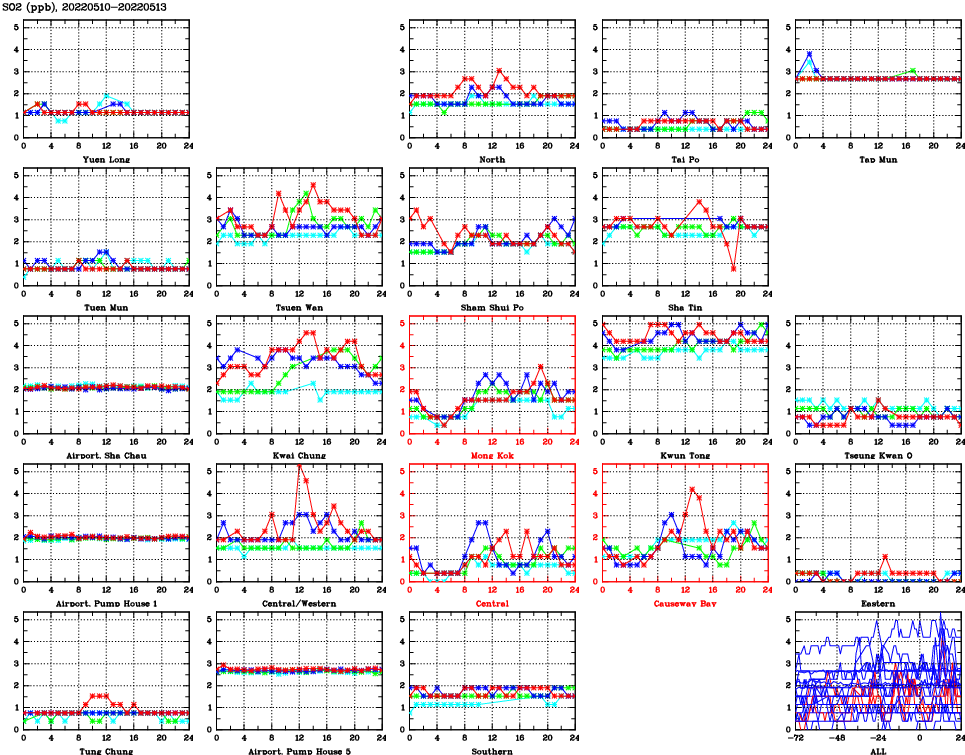 | Air Quality Data Time Series for SO2 (2022/05/13) | ( Line colors: Day -3 Day -2 Day -1 Current day ) | 2D Map Current AQHI |
