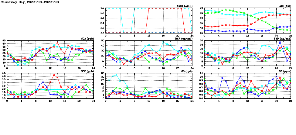 | Air Quality Data Time Series in Causeway Bay (2022/05/13) | ( Line colors: Day -3 Day -2 Day -1 Current day ) | 2D Map Current AQHI |