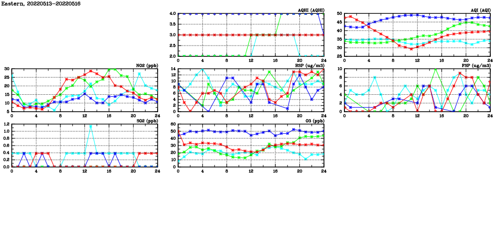 | Air Quality Data Time Series in Eastern (2022/05/16) | ( Line colors: Day -3 Day -2 Day -1 Current day ) | 2D Map Current AQHI |