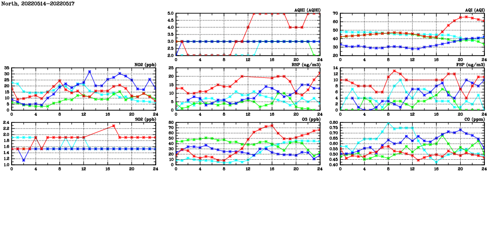 | Air Quality Data Time Series in North (2022/05/17) | ( Line colors: Day -3 Day -2 Day -1 Current day ) | 2D Map Current AQHI |