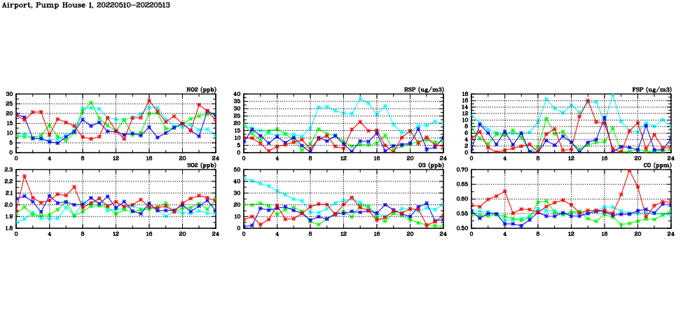 | Air Quality Data Time Series in Airport, Pump House 1 (2022/05/13) | ( Line colors: Day -3 Day -2 Day -1 Current day ) | 2D Map Current AQHI |
