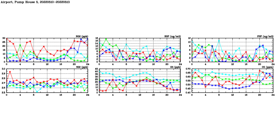 | Air Quality Data Time Series in Airport, Pump House 5 (2022/05/13) | ( Line colors: Day -3 Day -2 Day -1 Current day ) | 2D Map Current AQHI |