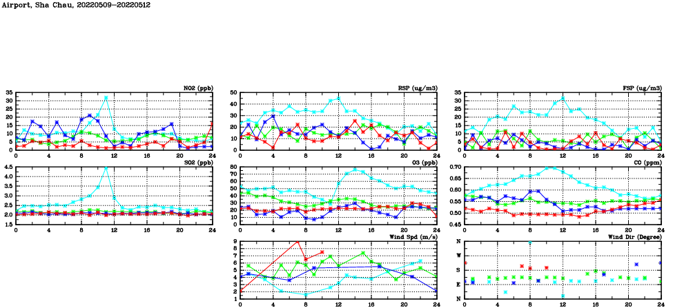| Air Quality Data Time Series in Airport, Sha Chau (2022/05/12) | ( Line colors: Day -3 Day -2 Day -1 Current day ) | 2D Map Current AQHI |