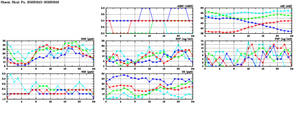 | Air Quality Data Time Series in Sham Shui Po (2022/05/16) | ( Line colors: Day -3 Day -2 Day -1 Current day ) | 2D Map Current AQHI |
