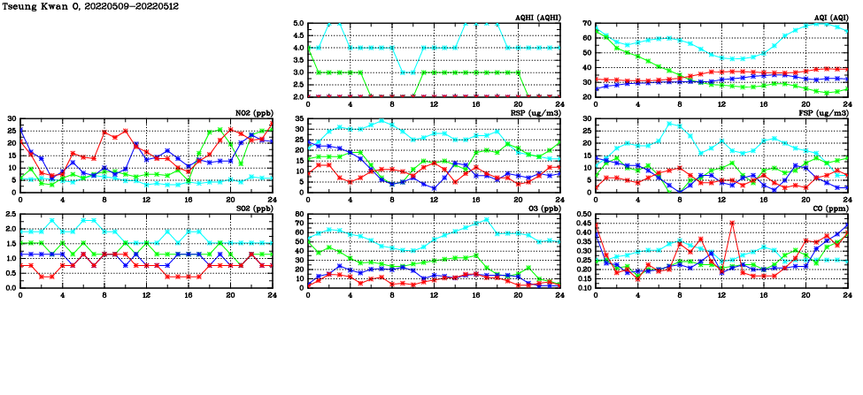 | Air Quality Data Time Series in Tseung Kwan O (2022/05/12) | ( Line colors: Day -3 Day -2 Day -1 Current day ) | 2D Map Current AQHI |