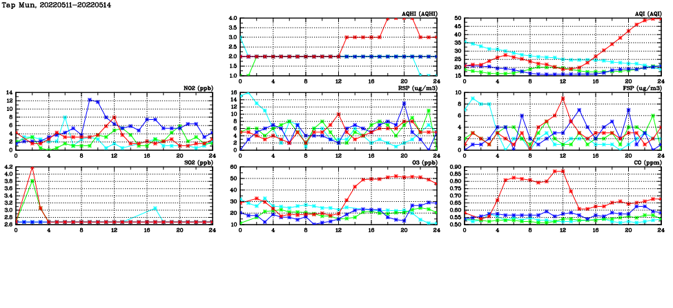 | Air Quality Data Time Series in Tap Mun (2022/05/14) | ( Line colors: Day -3 Day -2 Day -1 Current day ) | 2D Map Current AQHI |