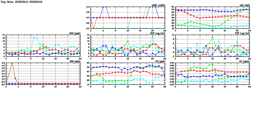 | Air Quality Data Time Series in Tap Mun (2022/05/16) | ( Line colors: Day -3 Day -2 Day -1 Current day ) | 2D Map Current AQHI |
