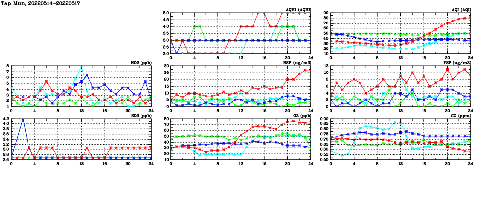 | Air Quality Data Time Series in Tap Mun (2022/05/17) | ( Line colors: Day -3 Day -2 Day -1 Current day ) | 2D Map Current AQHI |