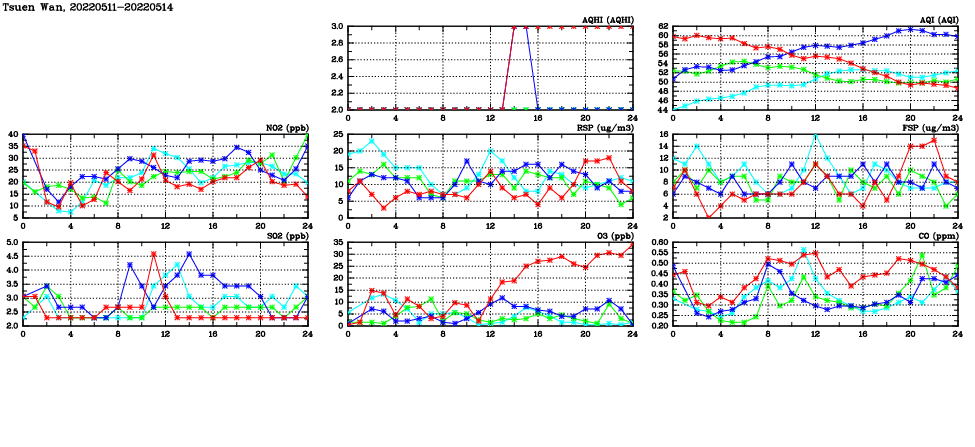 | Air Quality Data Time Series in Tsuen Wan (2022/05/14) | ( Line colors: Day -3 Day -2 Day -1 Current day ) | 2D Map Current AQHI |