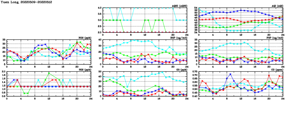 | Air Quality Data Time Series in Yuen Long (2022/05/12) | ( Line colors: Day -3 Day -2 Day -1 Current day ) | 2D Map Current AQHI |