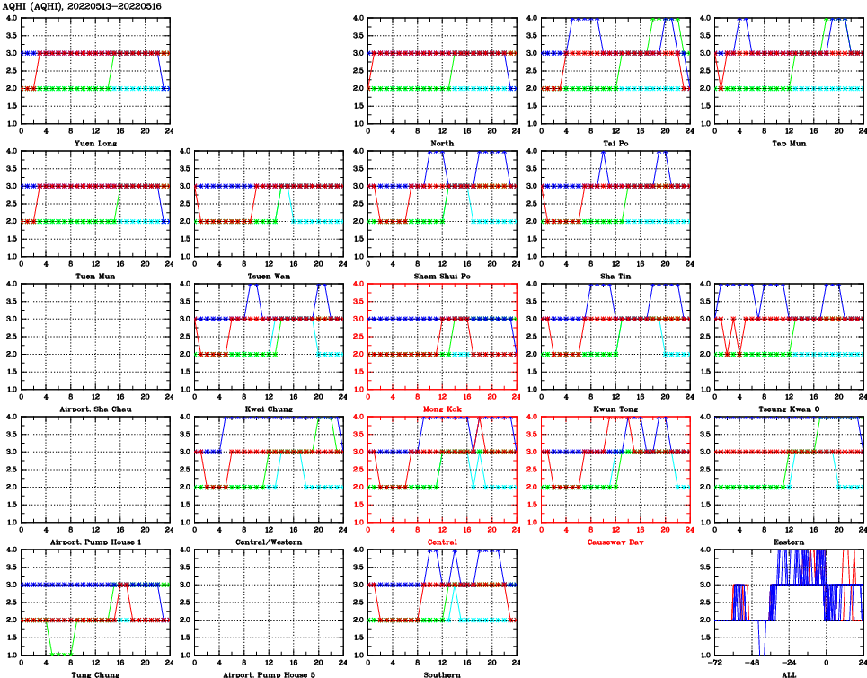 | Air Quality Data Time Series for AQHI (2022/05/16) | ( Line colors: Day -3 Day -2 Day -1 Current day ) | 2D Map Current AQHI |