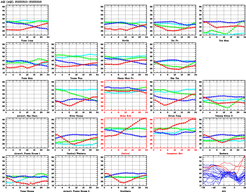 | Air Quality Data Time Series for AQI (2022/05/16) | ( Line colors: Day -3 Day -2 Day -1 Current day ) | 2D Map Current AQHI |