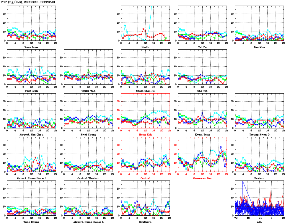 | Air Quality Data Time Series for FSP (2022/05/13) | ( Line colors: Day -3 Day -2 Day -1 Current day ) | 2D Map Current AQHI |